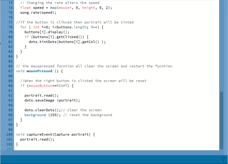 Create the dot portrait with the function of filters, color being defined with the volume and mousepressed clearing the screen.