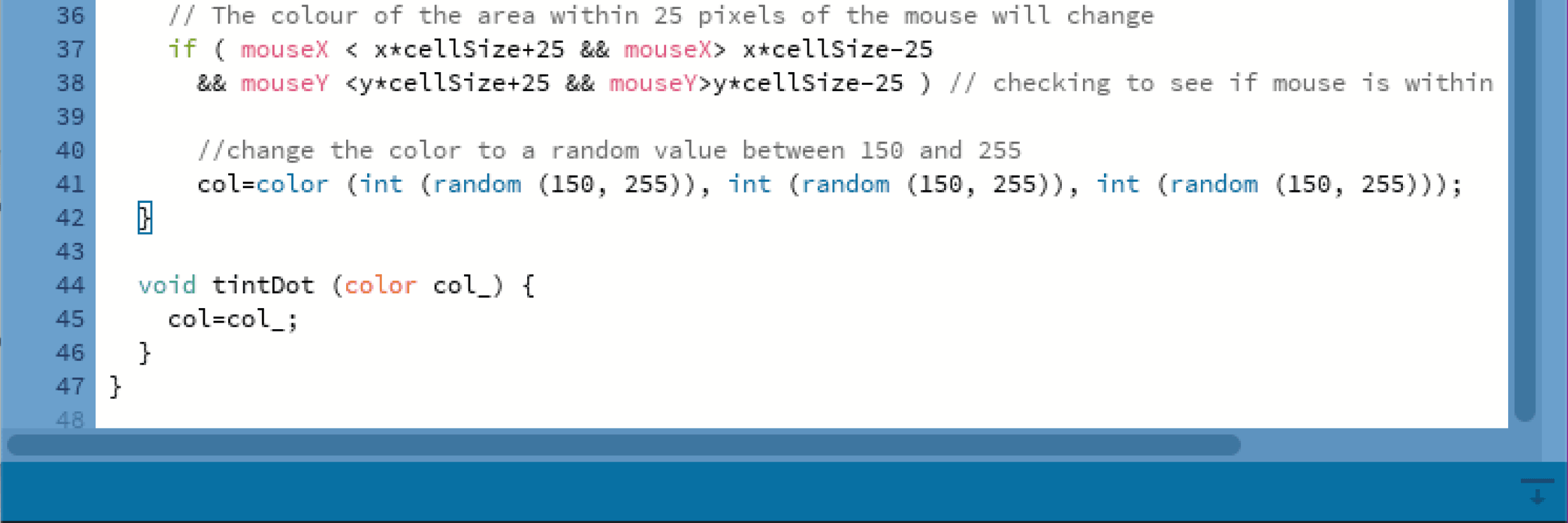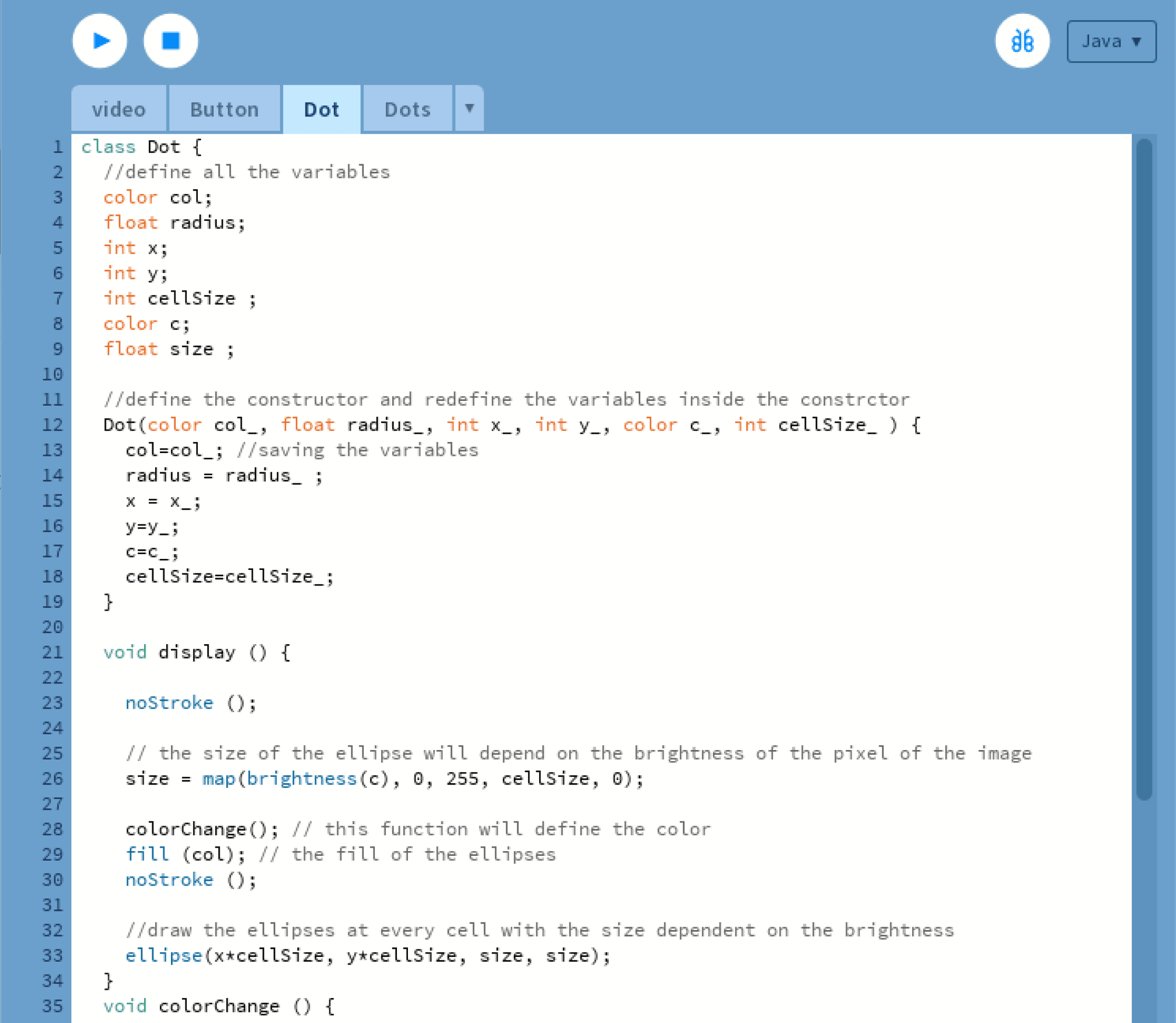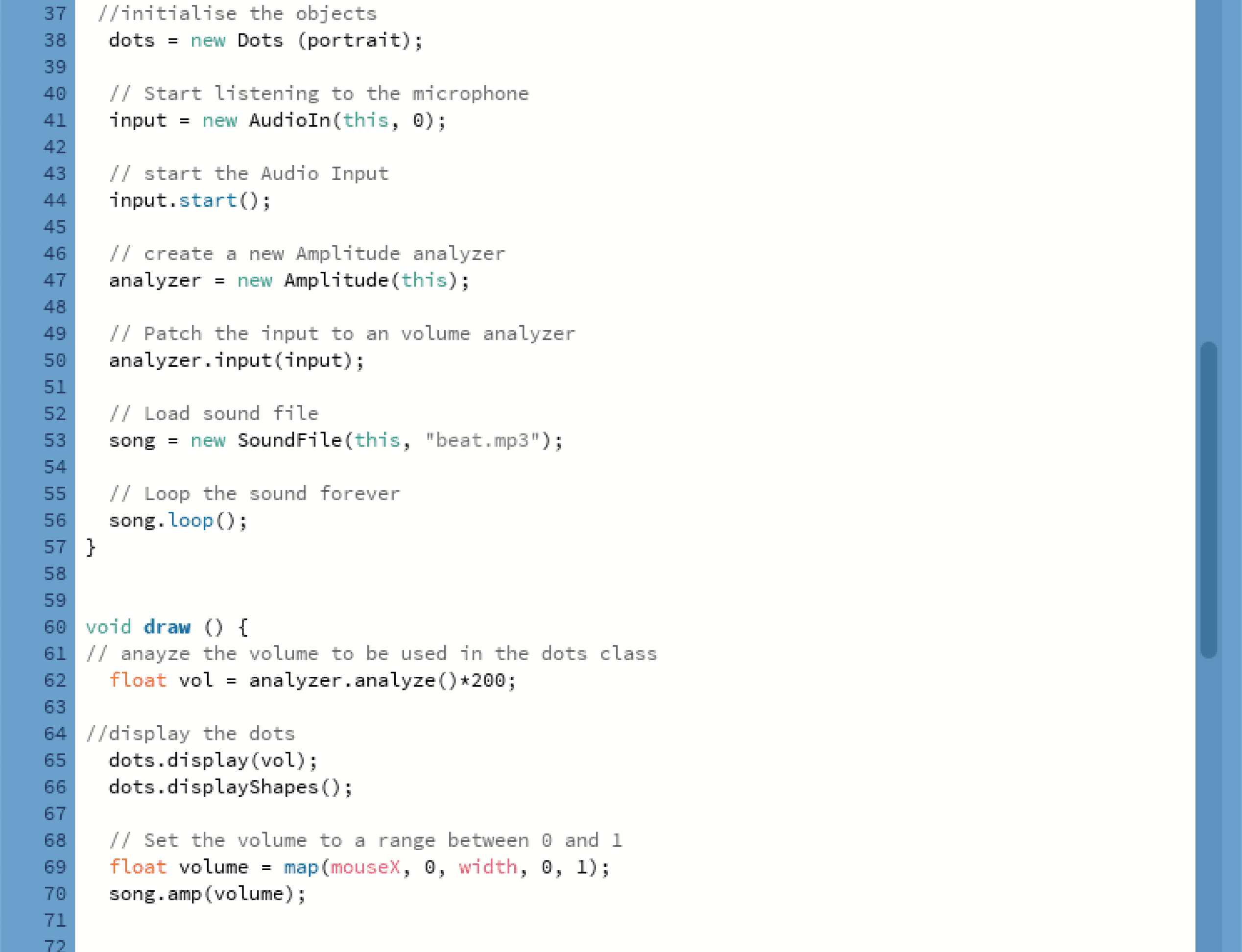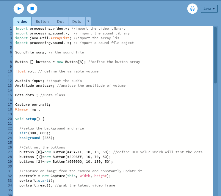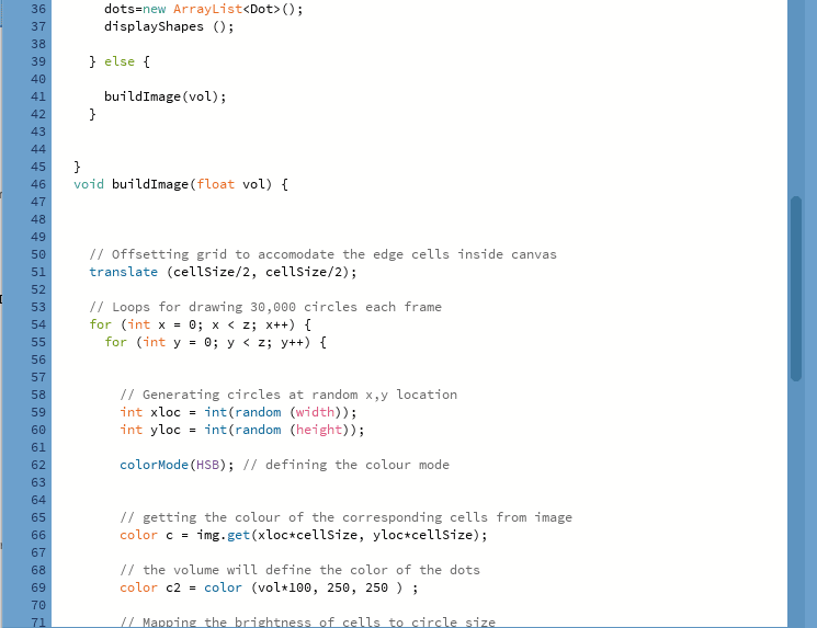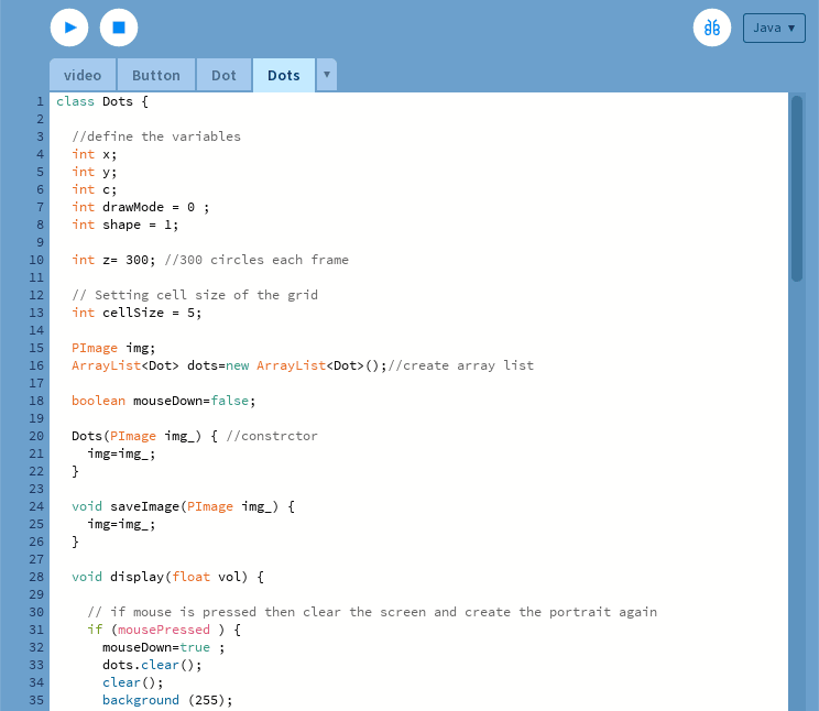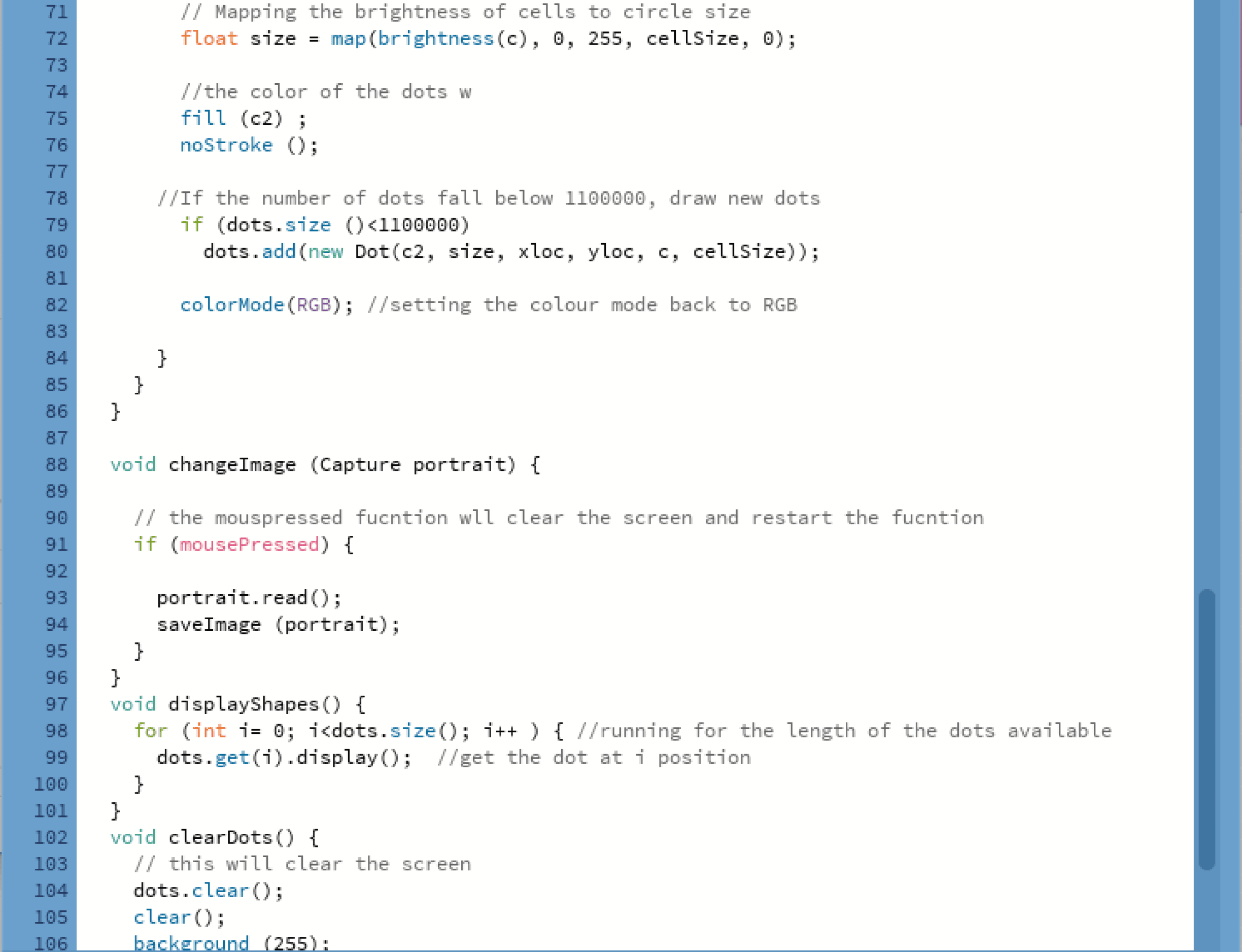 I wanted to create a pixel portrait by capturing a scene from the camera and turning it into dots. Instead of the shapes representing the colour of the image I wanted it to be triggered by the of the music file attached. Additionally I added some colour filters.